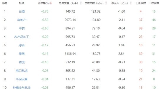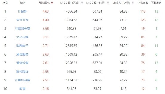 板块方面,IT服务、软件开发、互联网电商等板块涨幅居前,白酒、房地产、中药等板块跌幅居前。